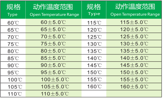 说明:复位温度为标准动作温度值的2/3,公差为 ±15℃ ,或由用户指定。
