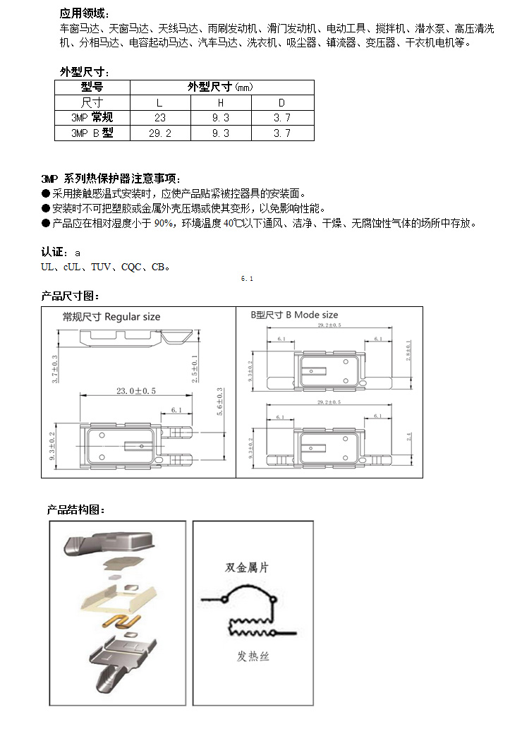 3MP系列热保护器技术参数